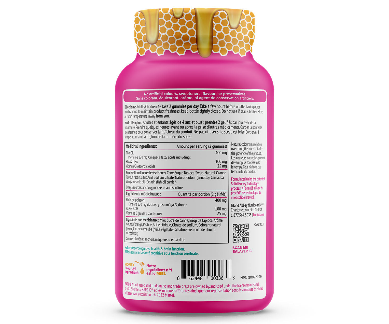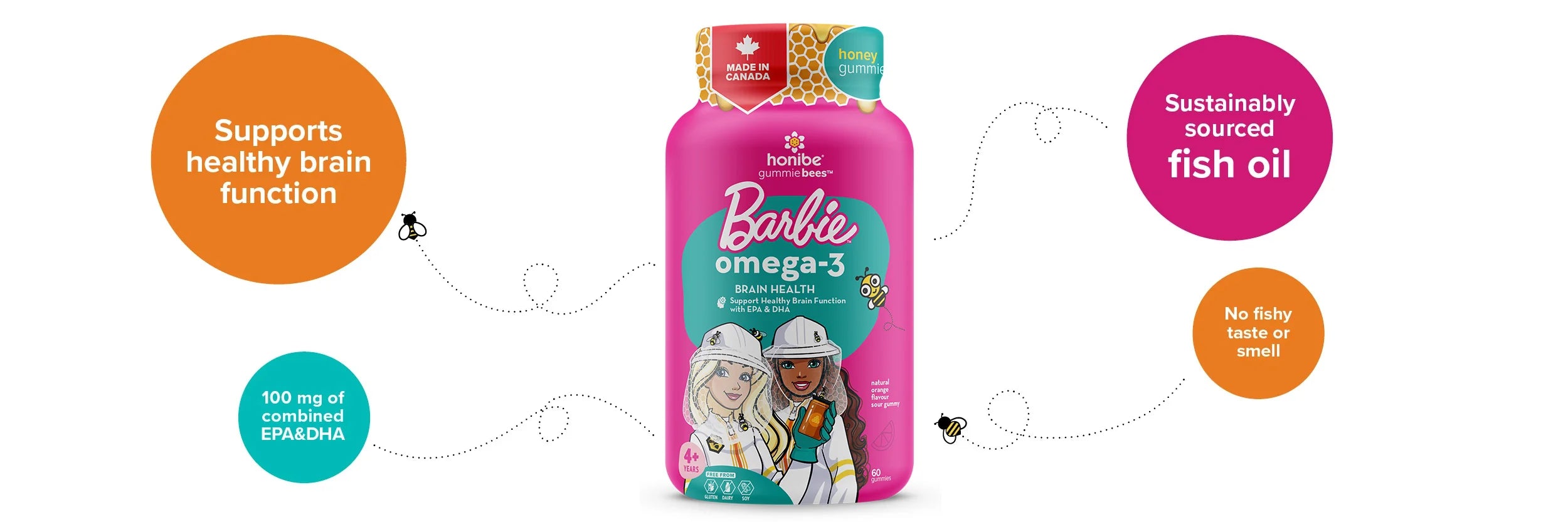 Introducing Barbie™ Omega-3 Gummie Bees, where honey takes center stage in a delightful journey to support your child's healthy brain function! 🍯