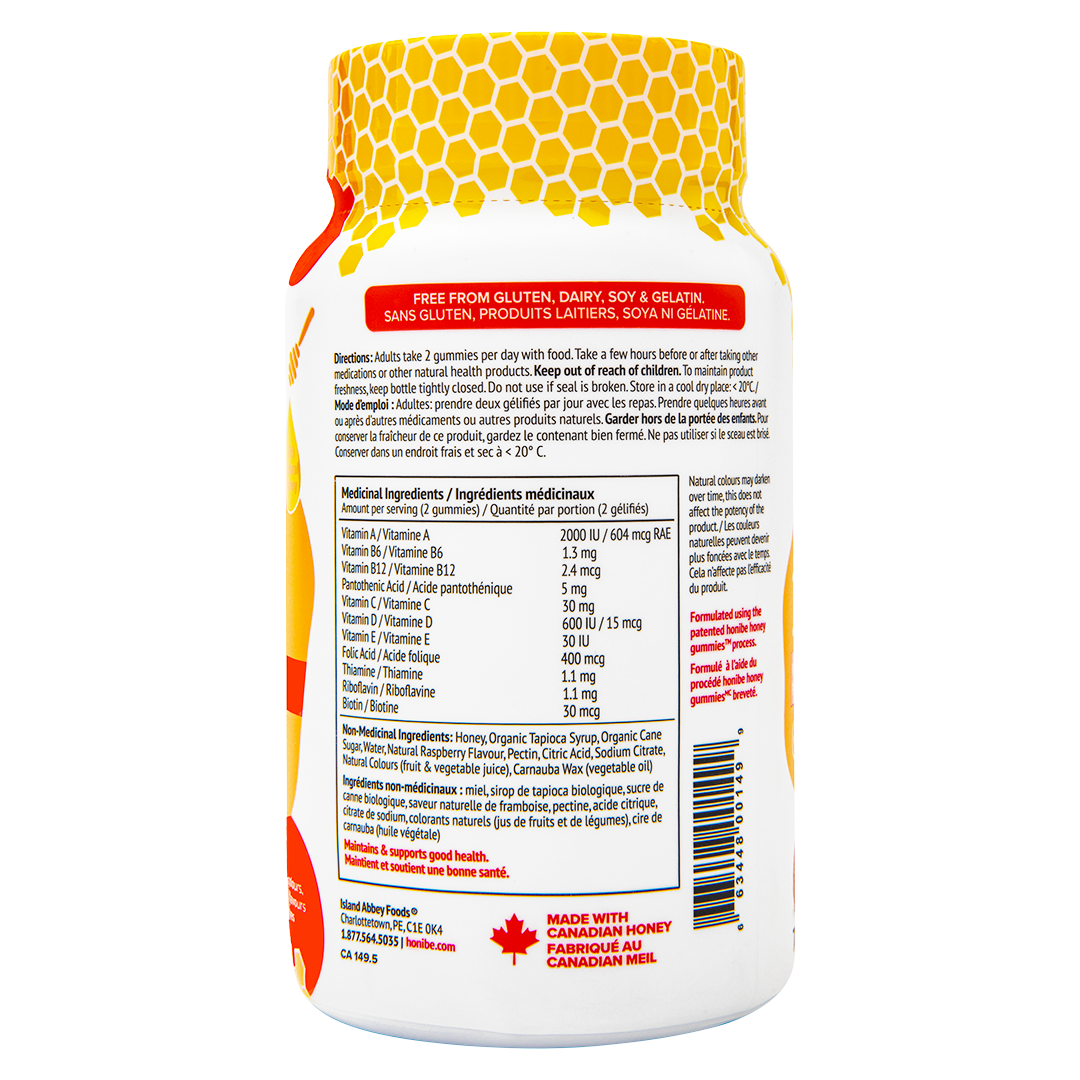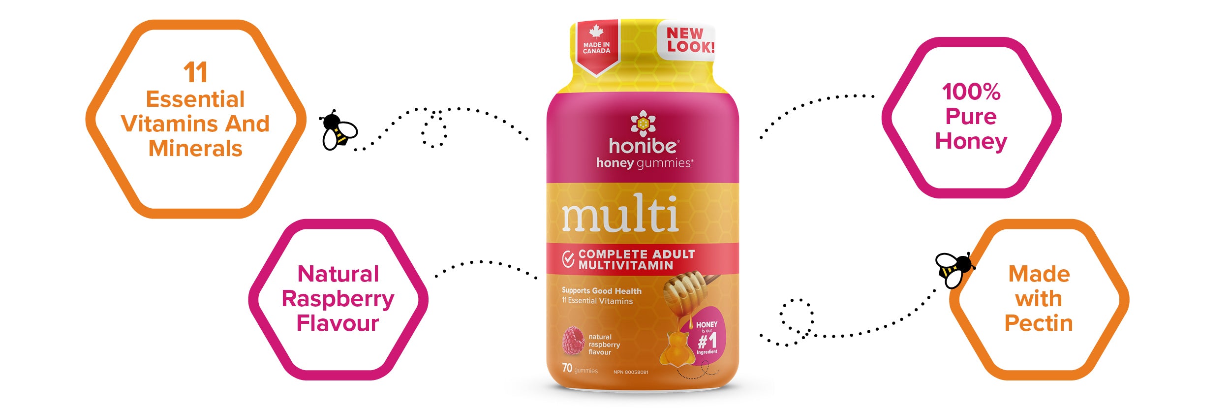 🍁 100% Canadian, eh?: Honibe is proud to be a Canadian business. We manufacture all of our products in beautiful PEI and source natural honey from all across Canada. We want nothing but the best for our fellow Canadians, so our gummies do not contain any artificial colours, flavours, sweeteners or preservatives. They are also free from gluten, dairy, soy, and common allergens.