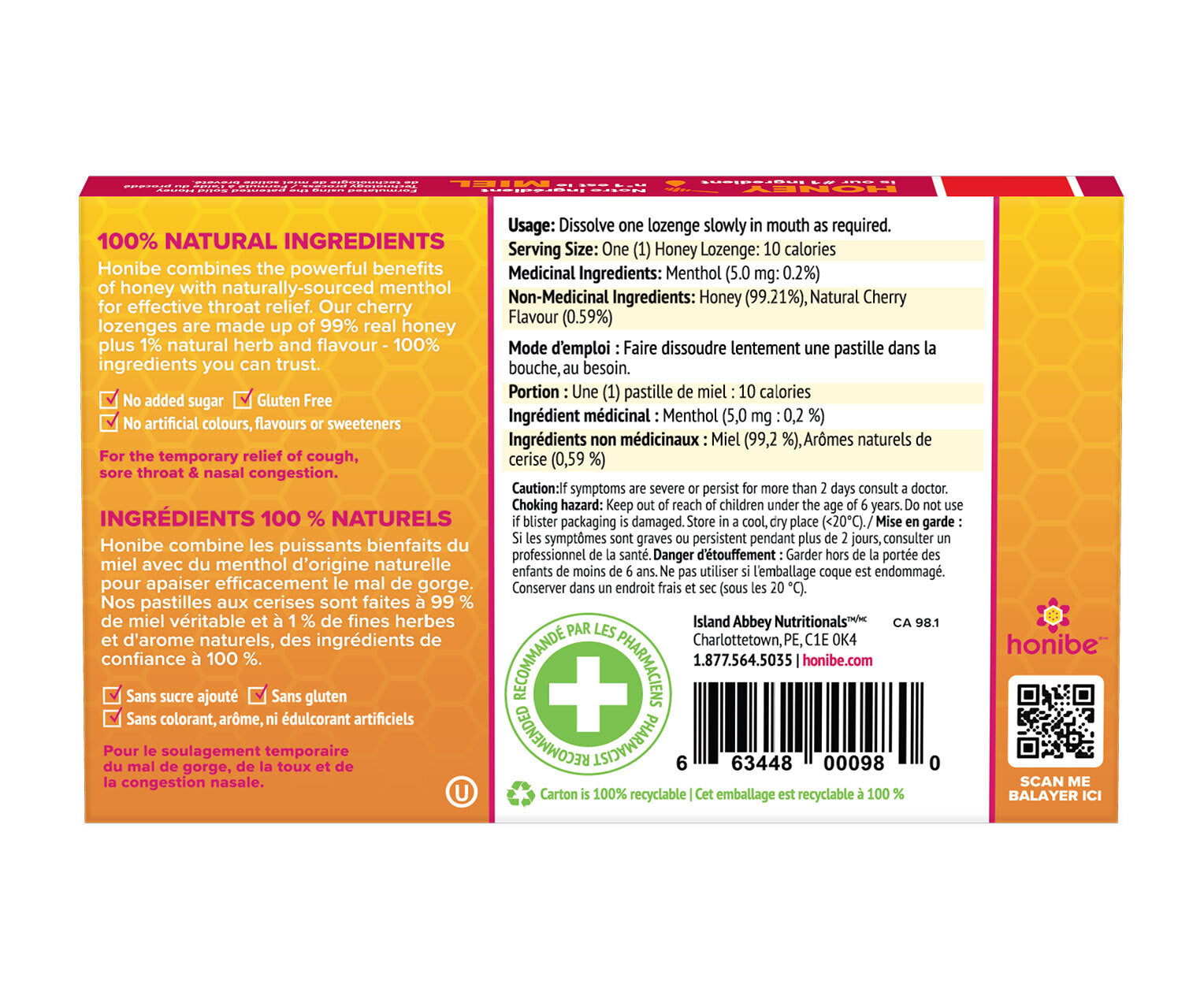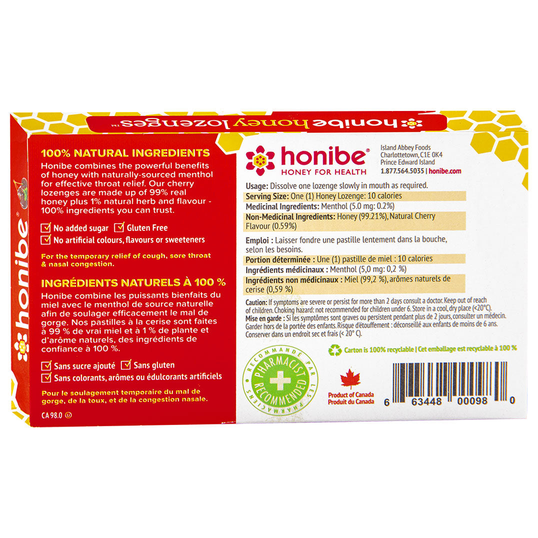 | Non-Medicinal Ingredients: Honey (99.2%), Natural Cherry Flavour (0.59%), Non-GM Corn Maltodextrin (Gluten Free Dusting, 0.01%) |