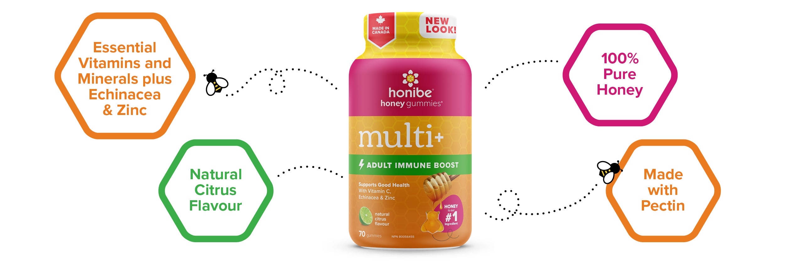 🍁 100% Canadian, eh?: Honibe is proud to be a Canadian business. We manufacture all of our products in beautiful PEI and source natural honey from all across Canada. We want nothing but the best for our fellow Canadians, so our gummies do not contain any artificial colours, flavours, sweeteners or preservatives. They are also free from gluten, dairy, soy, and common allergens